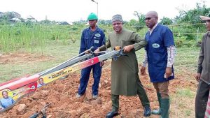 The Commissioner and other dignitaries were taken through the farm with explanations of the cultivation processes of the various crops and a practical demonstration of the locally fabricated machines which included; the power tiller, rice destoning machine, corn sheller, rice thrasher, and cart for easy conveyance of crops from the farm.